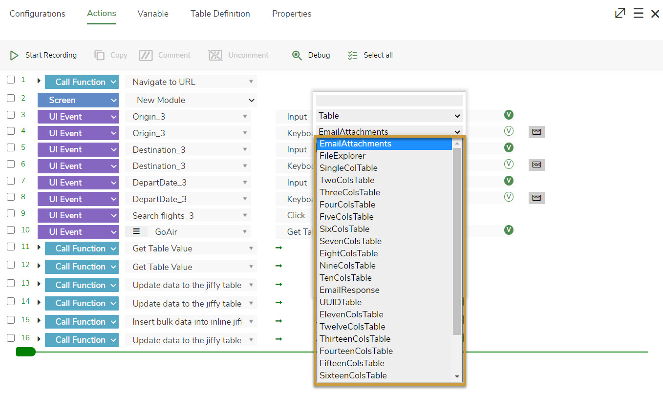 All types of variables, Input in red font, Local in black font and Secure in blue font are listed in the drop-down as shown below: